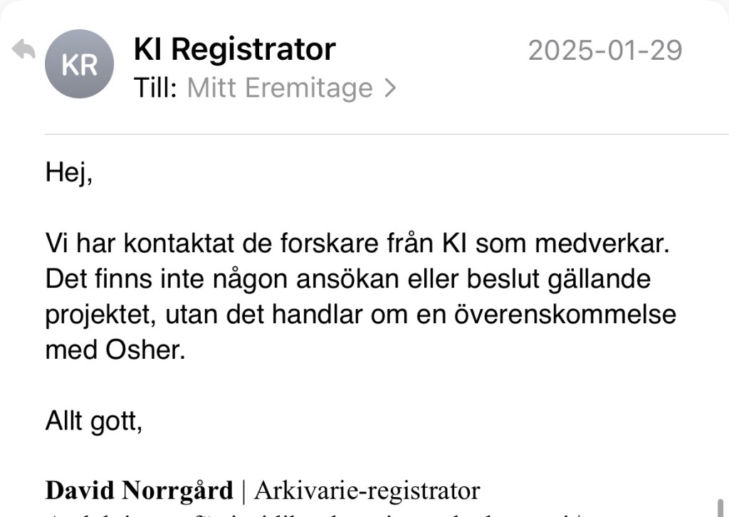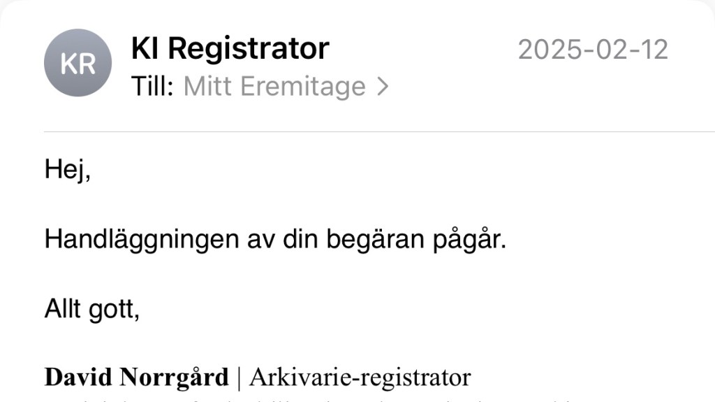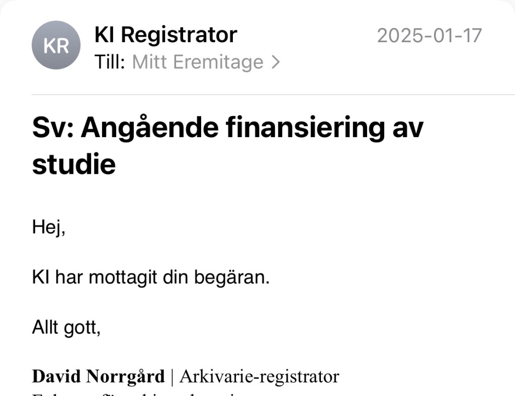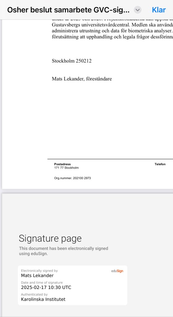 Dokumentet är daterat den 12 februari 2025 och underskrivet av föreståndare Mats Lekander den 17 februari. Att min begäran tog tid att hantera berodde alltså sannolikt på att det inte fanns någon dokumentation kring beslutet att finansiera Trötthetsstudien innan jag frågade efter den.