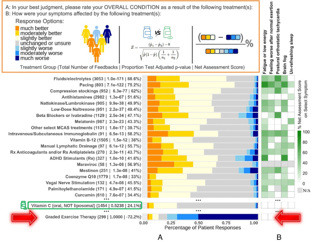 ”Av alla undersökta behandlingar fick graderad träningsterapi (GET) den i särklass lägsta NAS (−72,2 %), där den stora majoriteten av de tillfrågade patienterna rapporterade nackdelar och nästan ingen rapporterade nytta ( Fig. 2 A ).”
