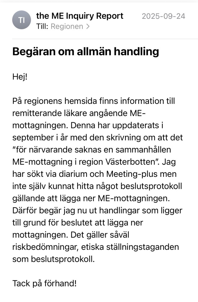 Region Västerbotten har alltså låtit ME sjuka stå i kö för vård under flera års tid och har fortfarande inte kontaktat dem med besked om att inget arbete görs för att starta upp mottagningen. De verkar inte ha förstått att sannolikheten är rätt hög att de flesta (alla?) på väntelistan inte har haft någon annanstans att vända sig för adekvat vård under denna tid. Vilket i sin tur kan innebära tre år av ytterligare väntan på korrekt diagnos och hög risk för vårdskada på grund av felaktig behandling.