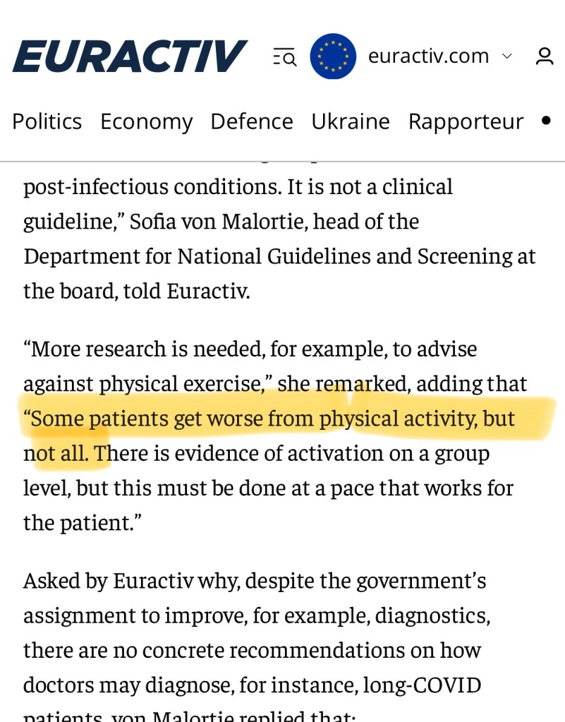 ”’Det behövs mer forskning, till exempel för att avråda från fysisk träning’, påpekade hon och tillade att ’vissa patienter mår sämre av fysisk aktivitet, men inte alla. Det finns bevis för aktivering på gruppnivå, men detta måste ske i en takt som passar patienten.’”