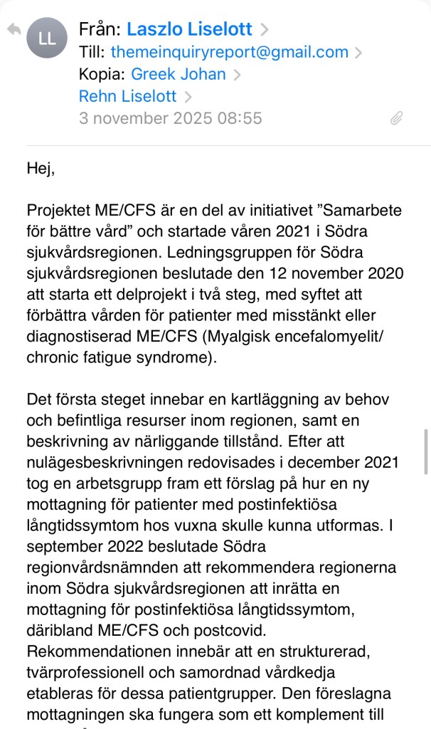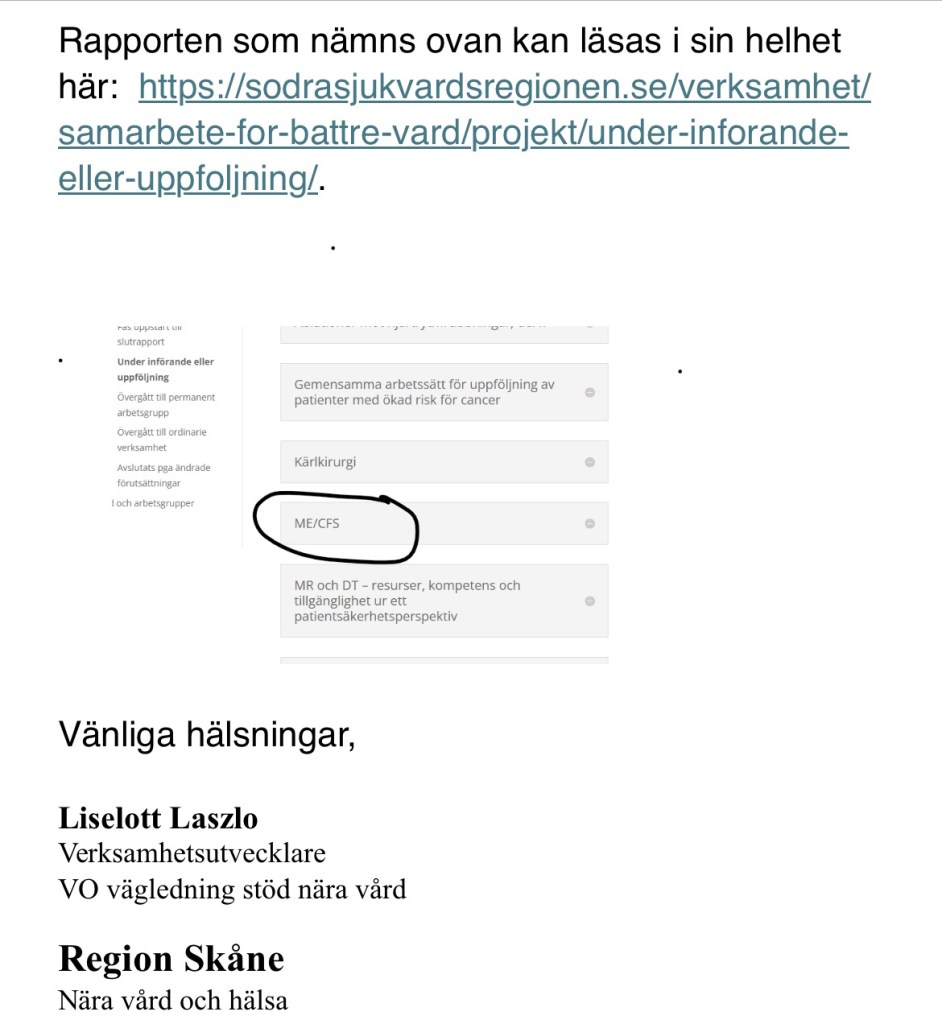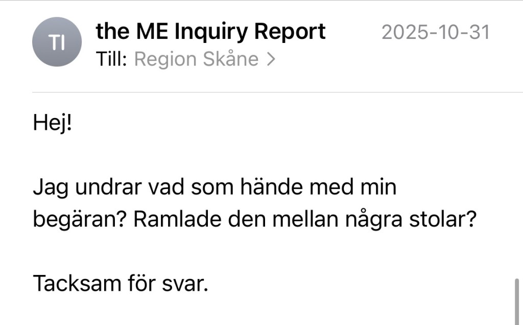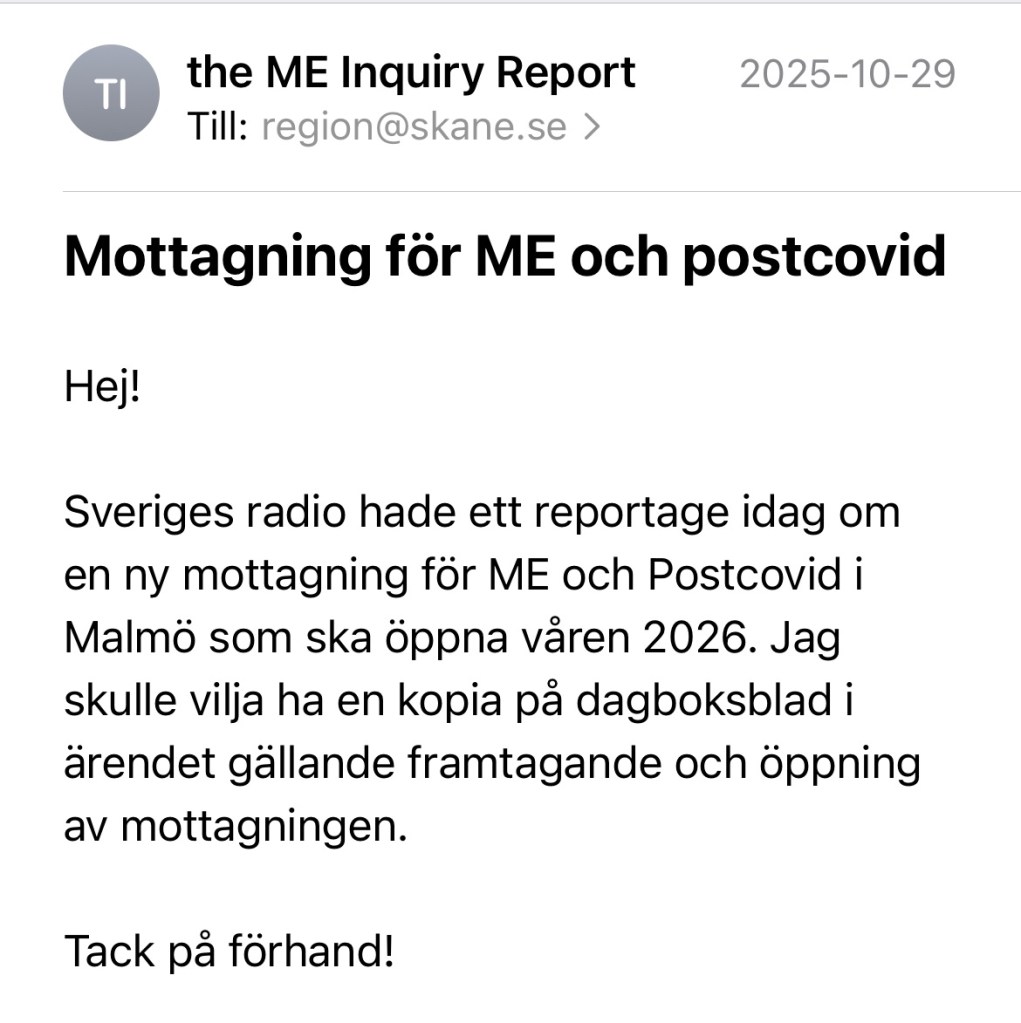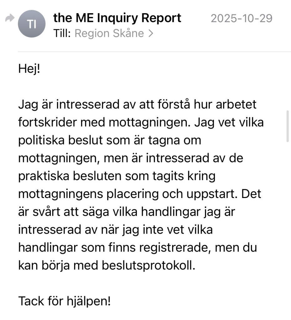 Jag har tidigare skrivit om södra sjukvårdsregionens planer på en mottagning för ME och postcovid. Det första inlägget skrev jag i januari 2023 efter jag upptäckt att region Västerbotten besökt projektgruppen och berättat om sitt digitala rehabiliteringsprojekt [länk]. Det är alltså samma projekt som fortfarande utreds av åklagare för misstänkt etikprövningsbrott [länk]. Jag skrev också inlägg i december 2024 [länk] och mars 2025 [länk] i samband med medias rapportering.