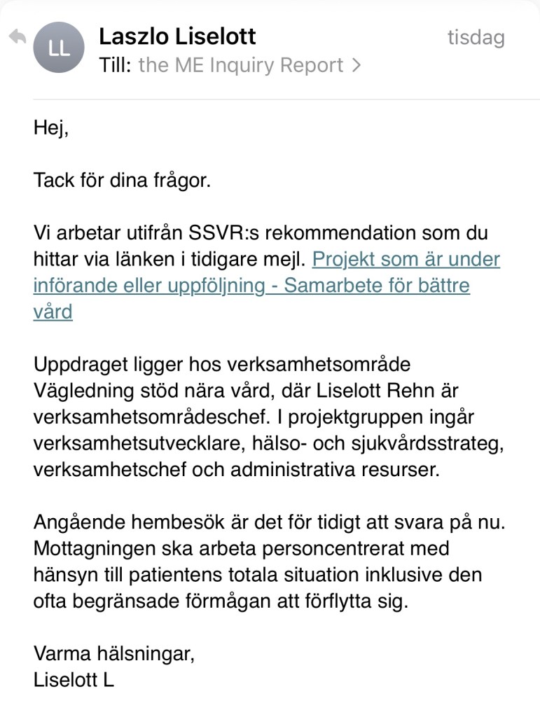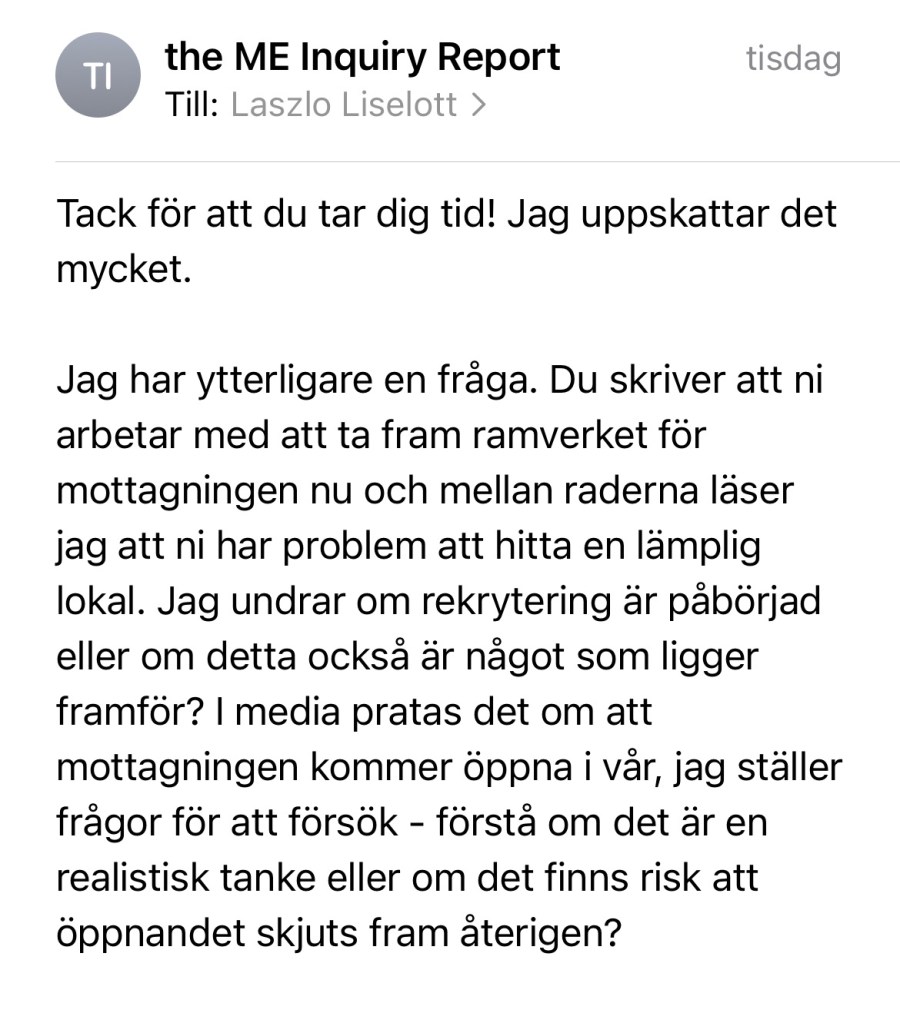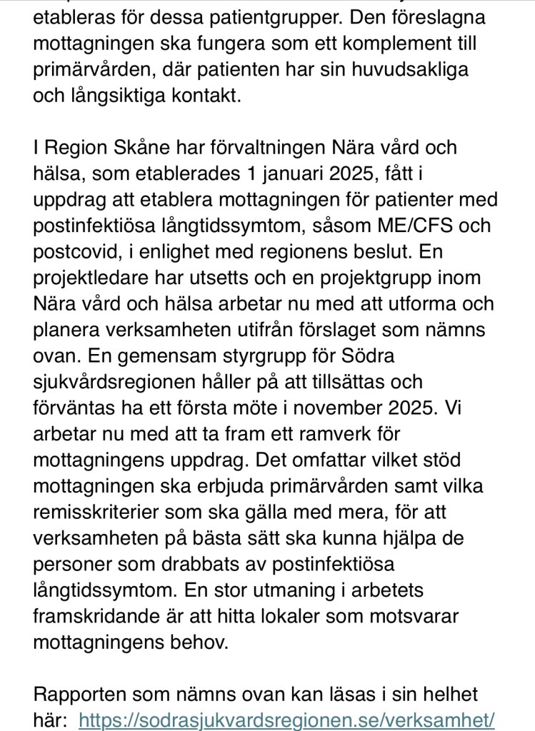 Ett par veckor senare, den 29 oktober, publicerade Sveriges radio ytterligare ett reportage om den nya mottagningen i Skåne, denna gång handlar reportaget både om ME och postcovid. Där framkommer att mottagningen ska ligga i Malmö och öppna ”snart” och ”i vår” och att det är många patienter som väntar på vård. Särskilt de svårast sjuka.